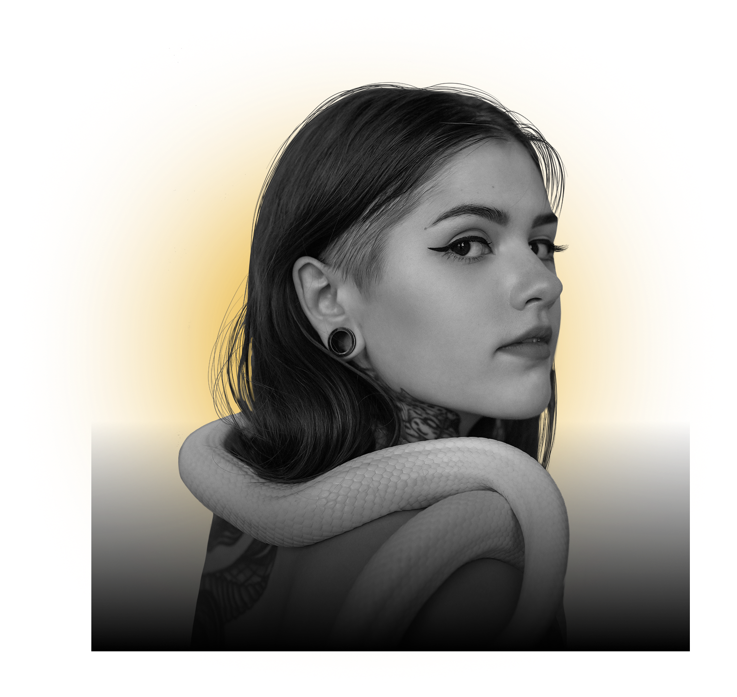 Это определило направленность в татуировке - основной сюжет моих работ: змеи, ящерицы, птицы, насекомые и растения в графическом стиле.